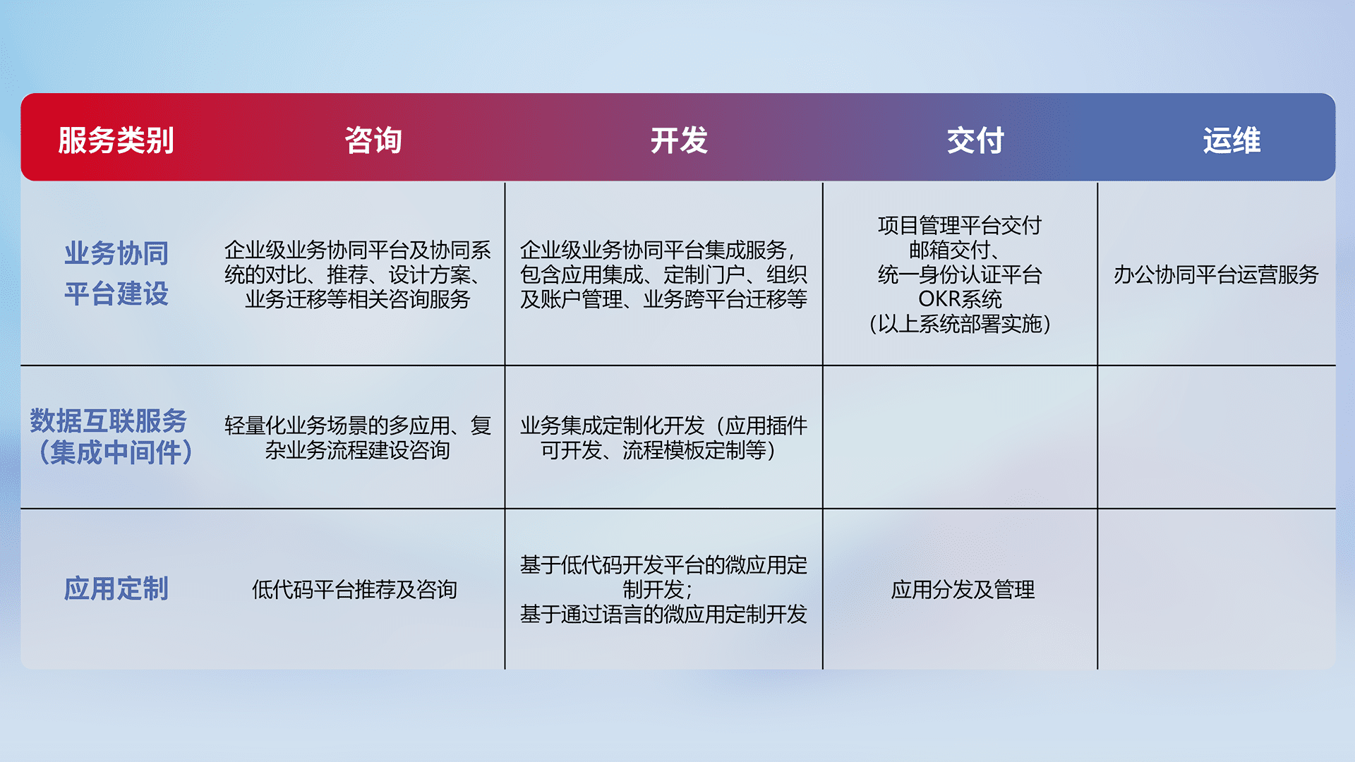 针对钉钉、、、企微、、、、IDaas等平台级产品提供产品的规划、、方案、、交付、、定制化开发等服务,,实现如统一协同办公、、、、智能客户服务、、、、混合会议管理、、、智能数据查询、、等业务场景,,,,实现数字化转型。。。